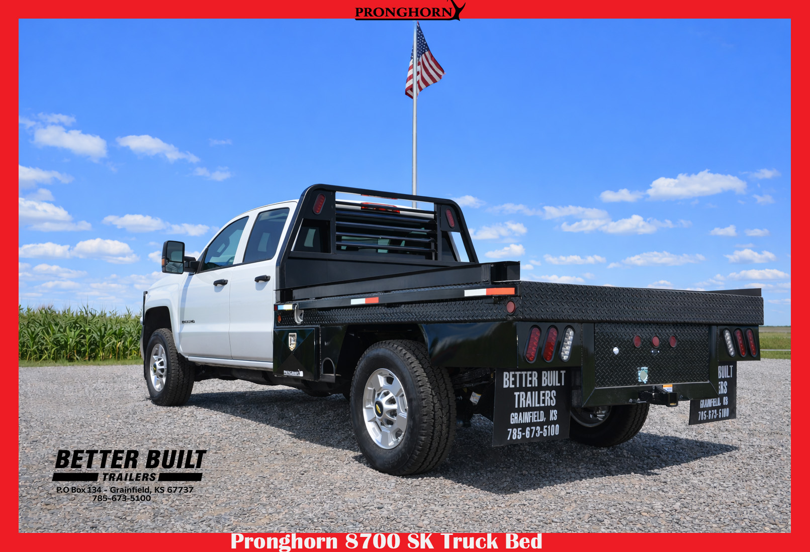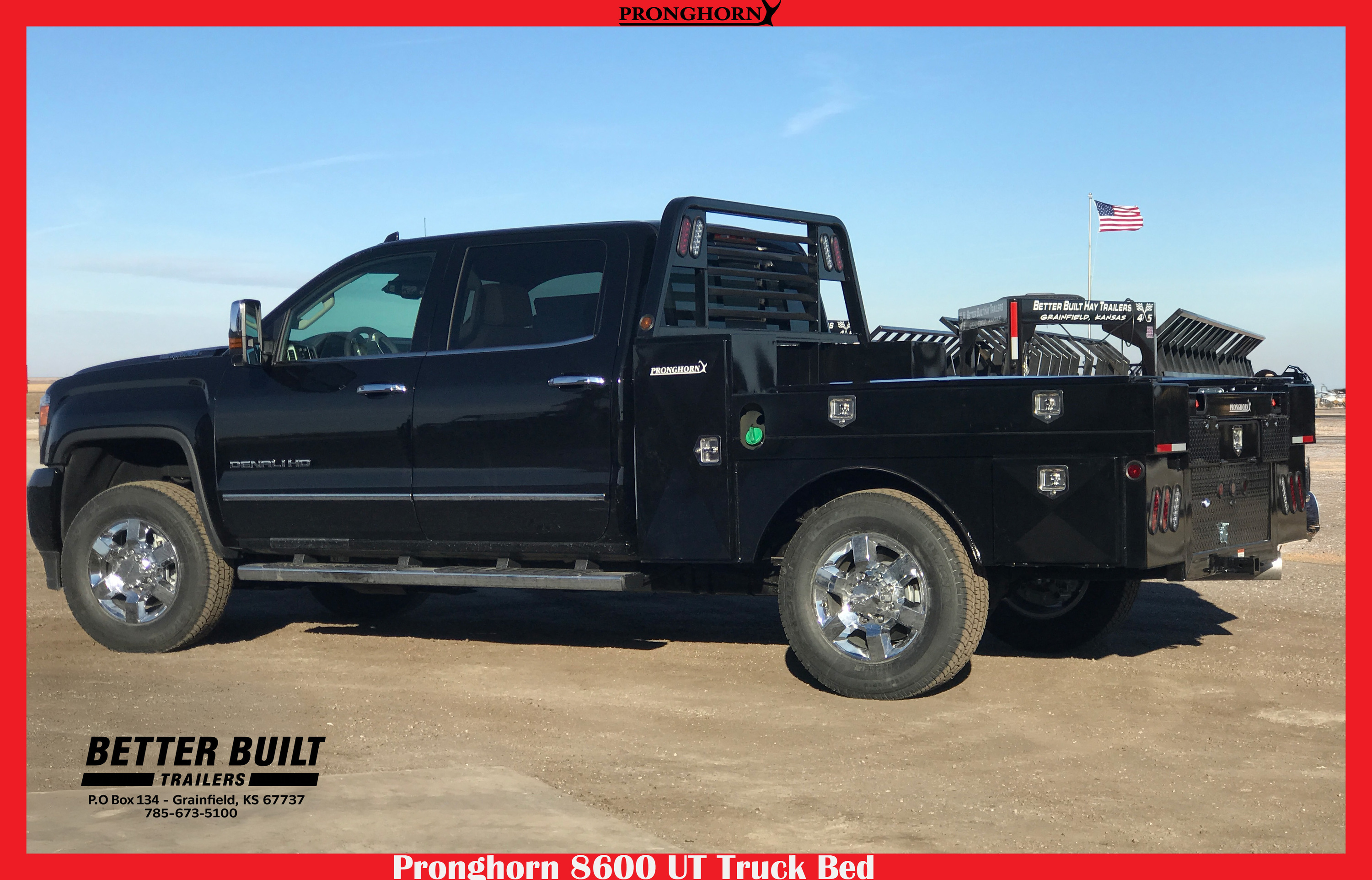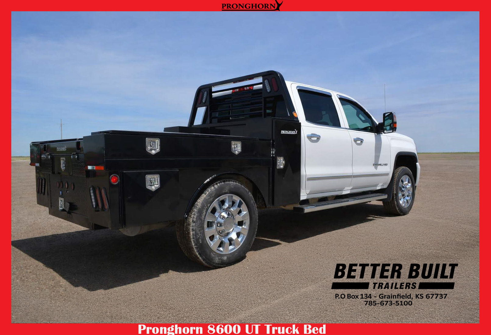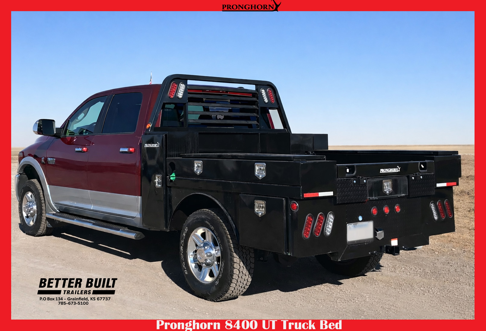 Various features that set Pronghorn Utility Flatbeds apart from the rest include: flip down tail gates, 4 interior-mounted D-rings, double headache rack lights, LED lights, 7 tool boxes, greaseable hinges, keyed T-lock handles, and 8’ and 9’ beds with footsteps.